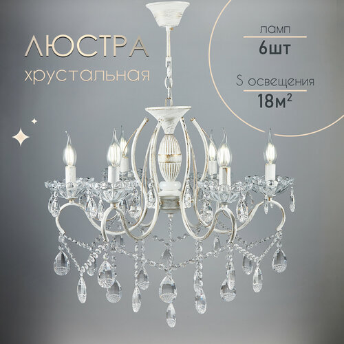 Люстра оснащена шестью плафонами, которые направлены в стороны и вверх. Плафоны изготовлены из хрусталя, что придает им прозрачность и блеск. Материал арматуры - металл, что гарантирует прочность и долговечность изделия.