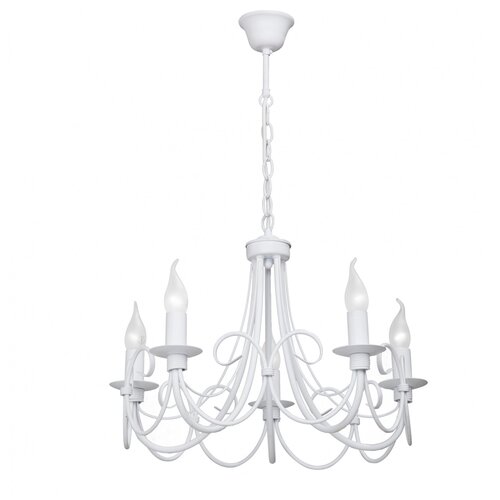 Подвесная люстра V3408/5 - товар от фабрики Vitaluce (Россия). Рассчитана на размещение в гостиной, кухне, кабинете, предпочтительный стиль дизайна - классический. Примерная площадь освещения 15 кв. м. при максимальной мощности в 300 Вт. Подвесная люстра имеет цоколь 5xE14 и устанавливается на металлический крюк. Основной материал изготовления - металл белого цвета.