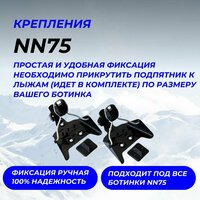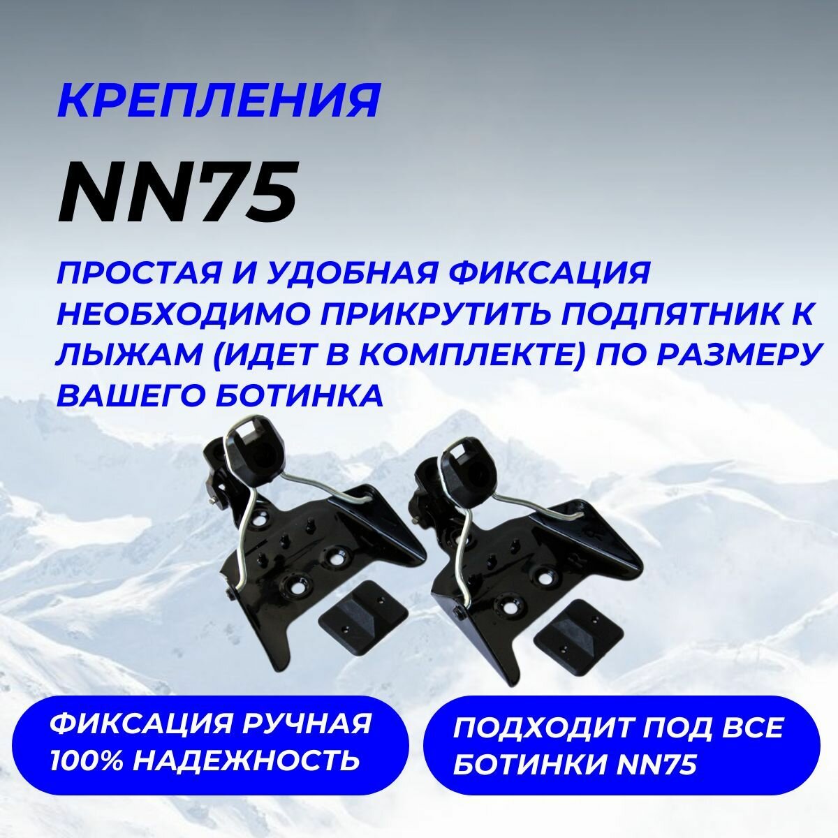 Крепления 75 мм (Nordic Norm 75мм) – это сверхпрочные высококачественные крепления. Клинообразный подпятник не позволит соскальзывать ботинку с лыжи. Для изготовления креплений используется конструкционная сталь повышенной степени обрабатываемости и полиамид ПА6.