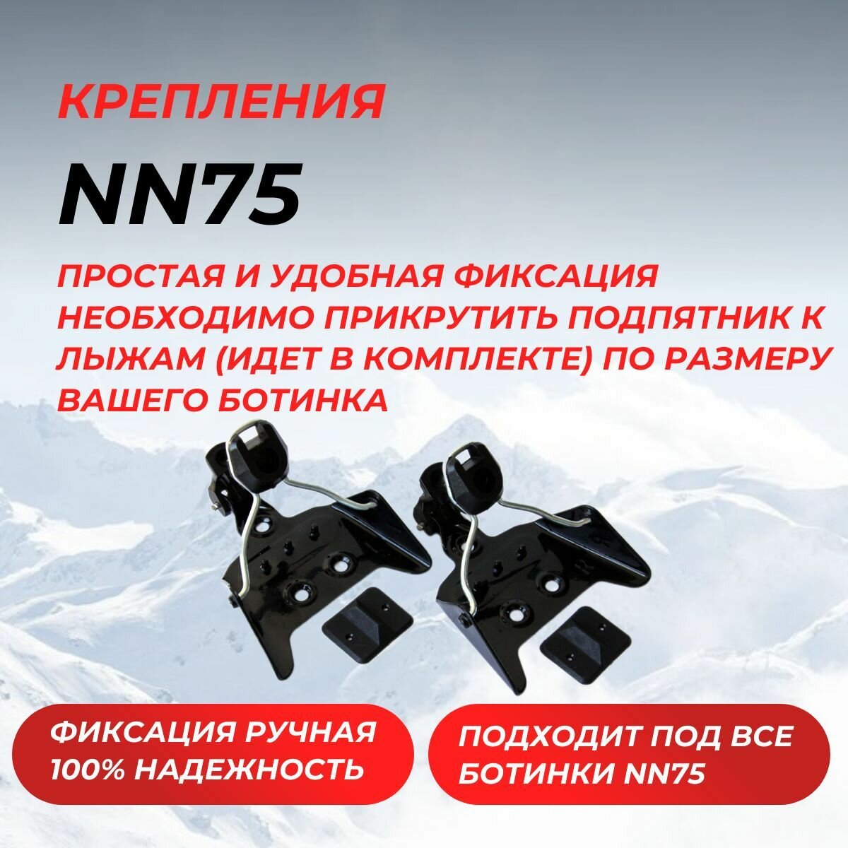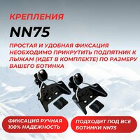 Крепления 75 мм (Nordic Norm 75мм) – это сверхпрочные высококачественные крепления. Клинообразный подпятник не позволит соскальзывать ботинку с лыжи. Для изготовления креплений используется конструкционная сталь повышенной степени обрабатываемости и полиамид ПА6.