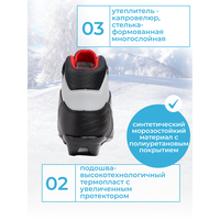 Комфортные ботинки для длительных прогулок и тренировок Условия эксплуатации до минус 30 С Система крепления совместимая с SNS Верх — высококачественный морозостойкий искусственный материал с ПВХ покрытием Эластичный водоотталкивающий термоклапан с полиуретановым покрытием Утеплитель — трёхслойный обувной материал «капровелюр», искусственный мех Конструкция – ботинок в ботинке Подошва — высокотехнологичный термопласт Улучшенная анатомическая колодка средней полноты Размеры: 37 — 47