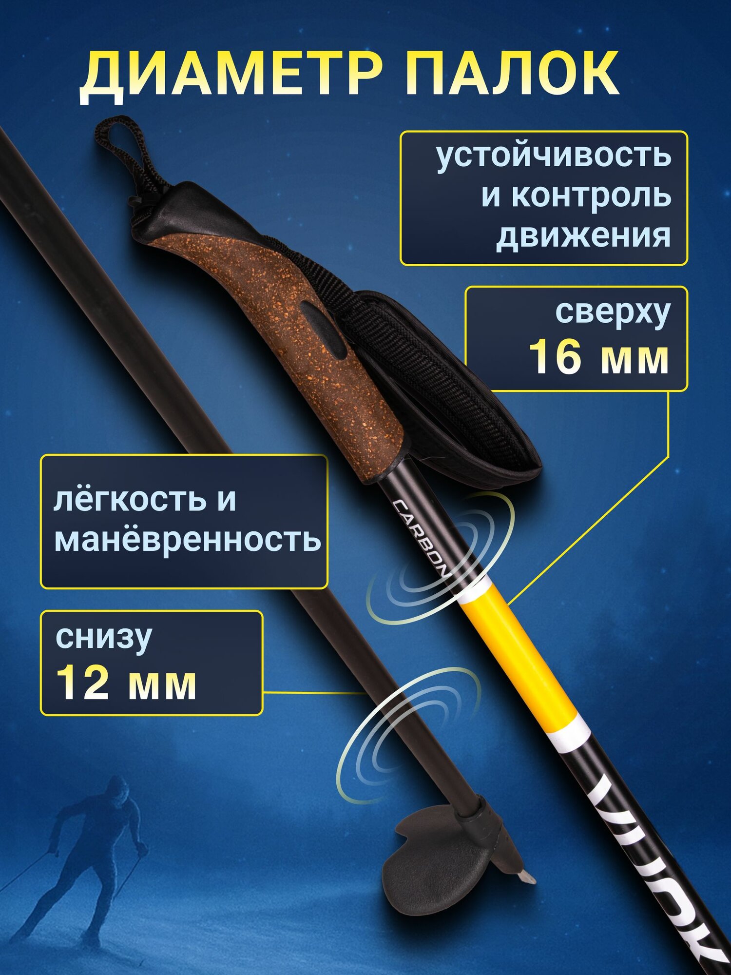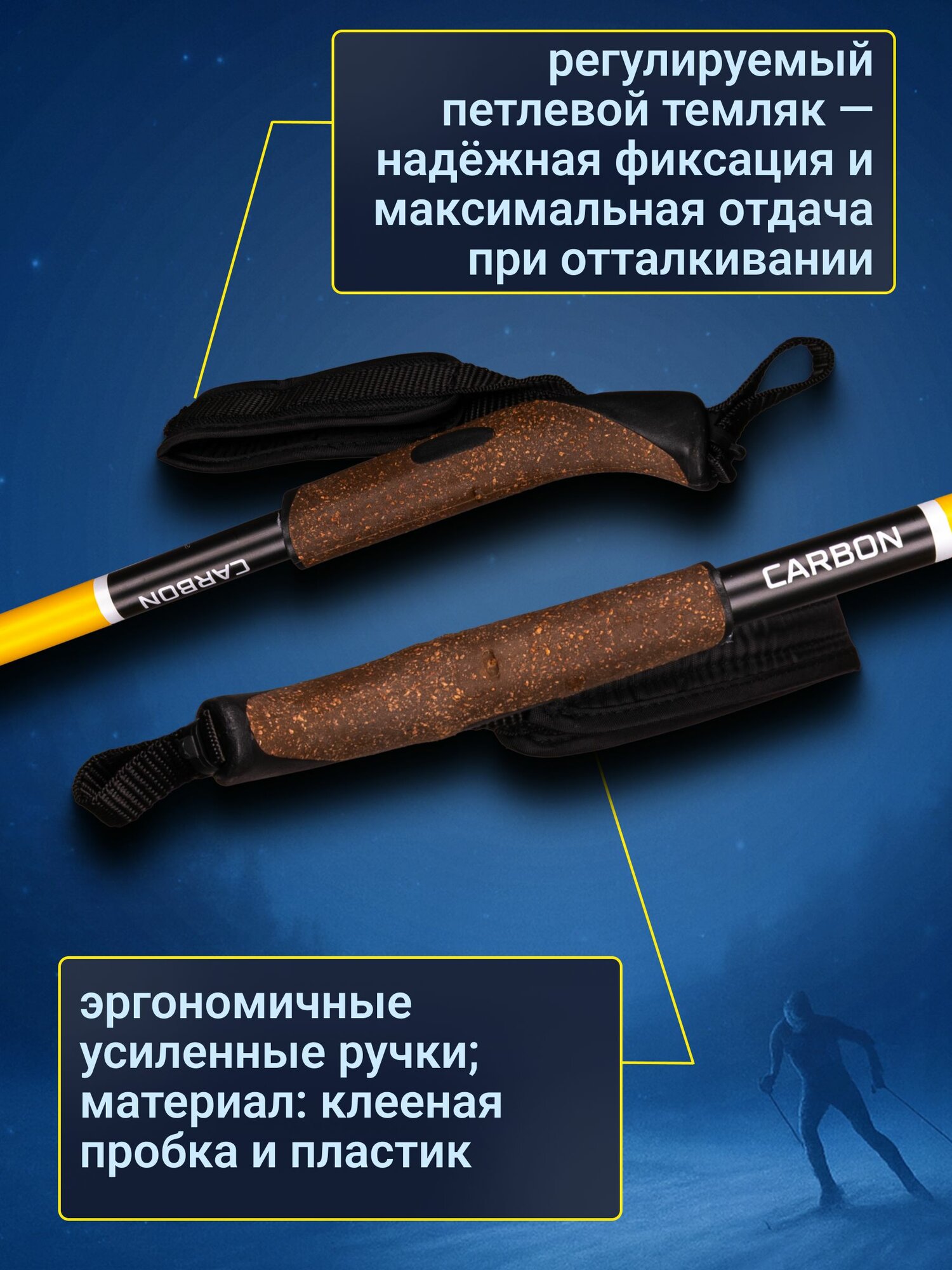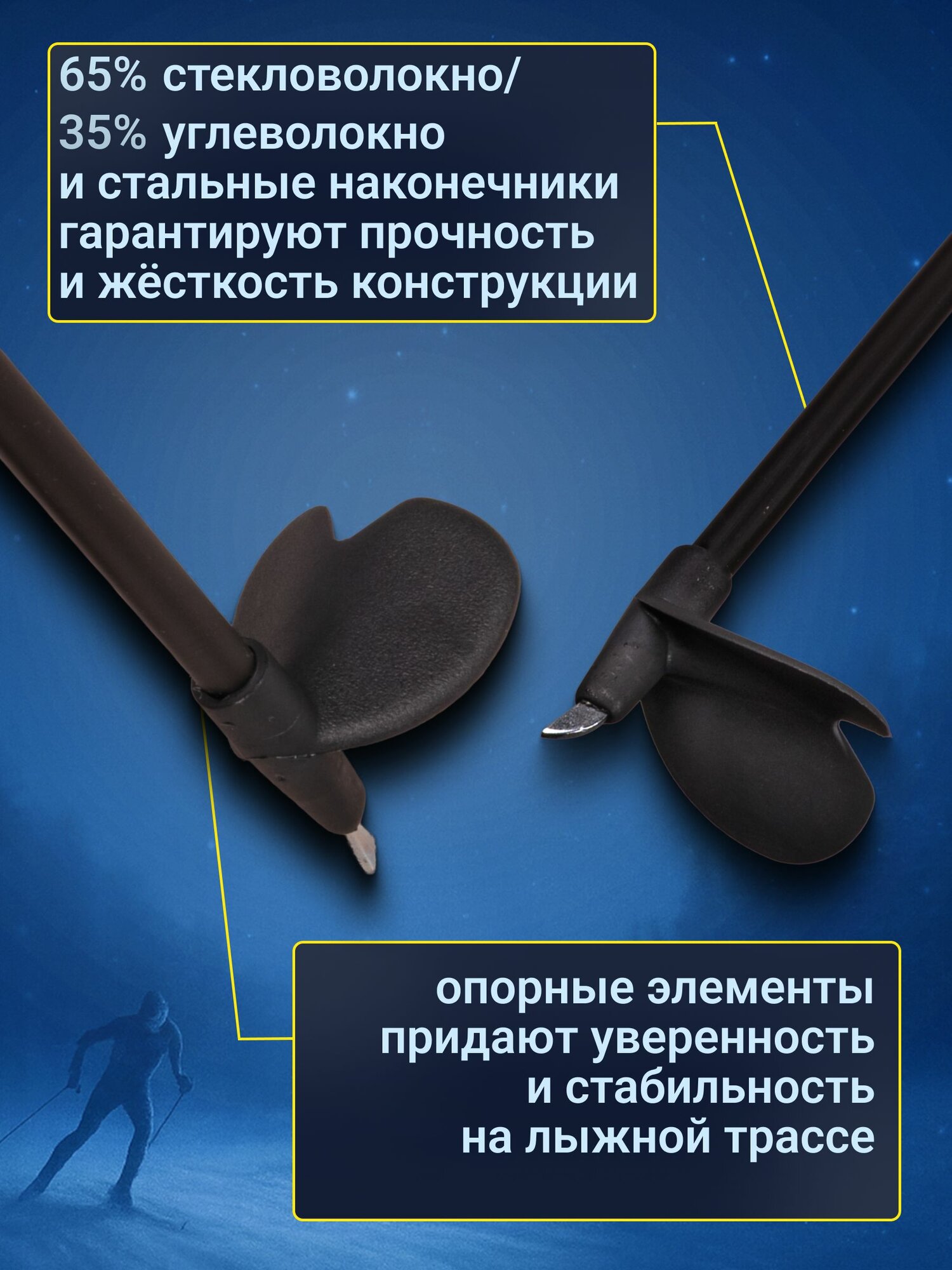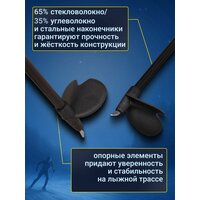 Лыжные палки VUOKATTI гибрид 65/35 чёрно-жёлтые — лёгкие и прочные палки для обучения, тренировок и активного отдыха. Лыжные палки VUOKATTI Hybrid 65/35 созданы для подростков и взрослых с начальным и любительским уровнем подготовки. Модель отлично подходит для занятий в школе и спортивных секциях, прогулочного катания, туристических маршрутов и первых тренировок. Универсальная конструкция делает палки удобными как для классического, так и для конькового стиля. Древко выполнено из гибридного материала: 65% стекловолокна и 35% карбона. Такое соотношение обеспечивает оптимальный баланс между лёгкостью, прочностью и износостойкостью. Палки хорошо гасят вибрации, эффективно передают усилие при отталкивании и помогают экономить энергию на дистанции. Разный диаметр стержня — 16 мм в верхней части и 12 мм в нижней — смещает центр тяжести вверх, благодаря чему палки легче переставлять и контролировать во время движения. Стальные наконечники обеспечивают надёжное сцепление со снегом и льдом, повышая стабильность и безопасность. Рукоятки изготовлены из сочетания пробки и пластика, что гарантирует удобный хват и предотвращает скольжение рук даже при активном катании. Регулируемые петлевые темляки надёжно фиксируют кисть и повышают эффективность толчка на ровных участках и подъёмах. Палки представлены в разных длинах. Для классического хода рекомендуется выбирать длину на 25–30 см ниже роста, для конькового — на 15–20 см ниже роста. Возможны незначительные различия во внешнем виде рукояток, которые не влияют на эксплуатационные характеристики. Преимущества - Гибридный состав: 65% стекловолокно / 35% карбон - Лёгкие и прочные, устойчивы к износу - Смещённый центр тяжести для удобной работы - Стальные наконечники с хорошим сцеплением - Эргономичные рукоятки из пробки и пластика - Регулируемые петлевые темляки - Подходят для подростков и взрослых - Универсальны для классического и конькового хода Лыжные палки VUOKATTI Hybrid 65/35 — это оптимальный выбор для тех, кто делает первые шаги в лыжном спорте или ищет надёжные и лёгкие палки для регулярного катания. Они обеспечивают комфорт, стабильность и эффективное отталкивание, помогая быстрее прогрессировать и получать удовольствие от каждой тренировки.