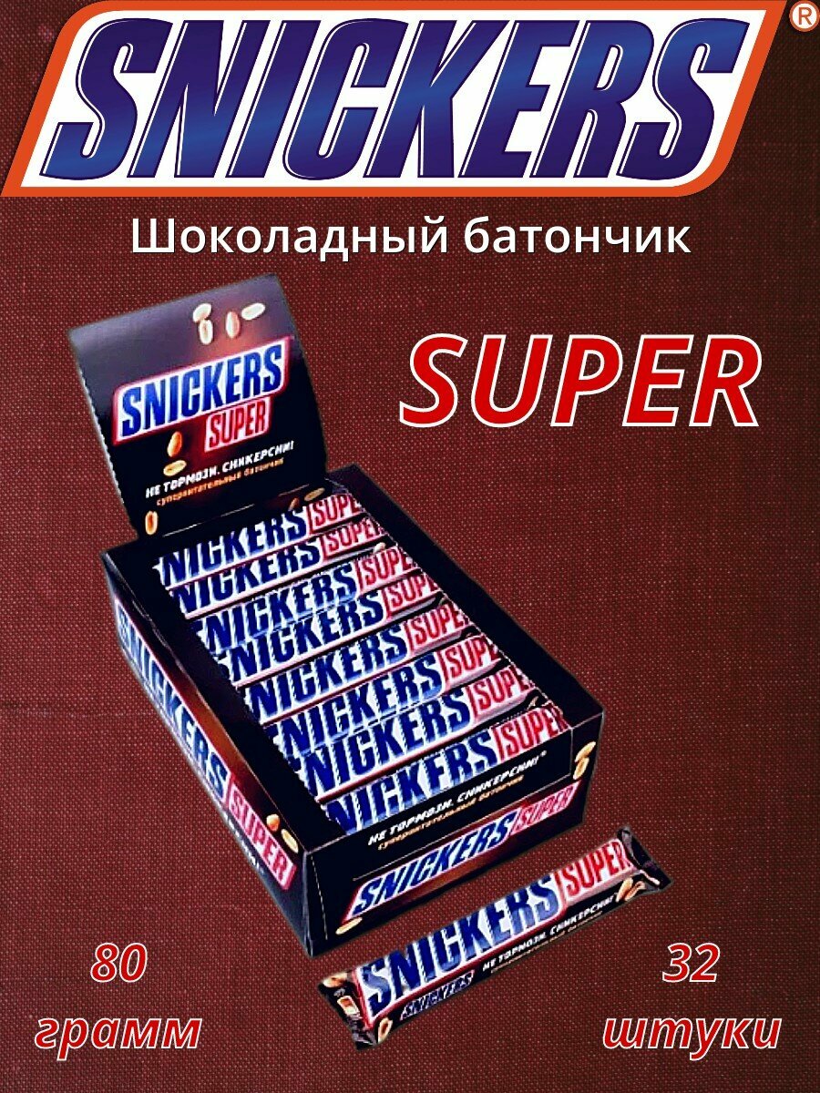 Выбирая Snickers Super шоколадный батончик, вы получаете изысканное лакомство с насыщенным вкусом и ароматом, которое станет отличным дополнением к чашке кофе или как сладкое угощение в течение дня.