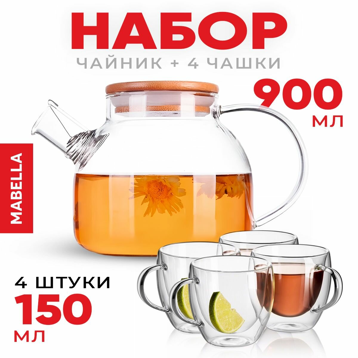 Купить Mabella, Сервиз чайный, чайник заварочный стеклянный «Бочонок 900 мл», набор кружек с двойными стенками 4 шт х 150 мл с доставкой по всей России.