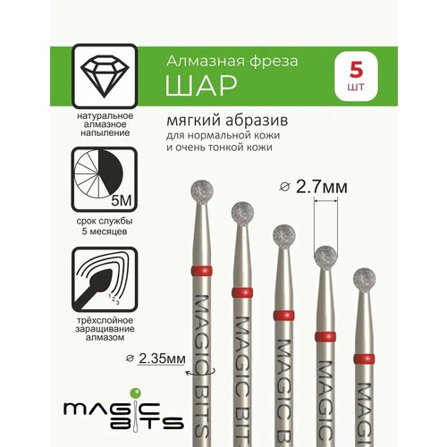 Фрезы Magic Bits. Набор из 5 штук. Новые уникальные алмазные фрезы с натуральной крошкой собственного производства в Санкт-Петербурге. Внимание! Обязательно наличие фирменной гравировки "Magic Bits"! Алмазный "Шар" для быстрого счищения кутикулы и обработки боковых валиков. Фреза "Шар" идеально подходит для работы с большинством типов кожи клиентов. Шар обладает уникальным абразивом, позволяющим легко счищать кутикулу и шлифовать срез. Не нагревается в работе. Не "разрывает" кожу при счищении. После работы с фрезой среднего и средне-мягкого абразива может потребоваться дополнительная полировка среза фрезой "Шар" или "Бутон" мягкого или экстрамягкого абразива. Рекомендуемая скорость 14-18 тыс. об. Диаметр фрезы - 2,7 мм. Общая длина фрезы - 4,5 см. Длина хвостовика - 4,3 см. Обработка фрез: 1. Очищаете фрезы с помощью УЗ-мойки или щетки. 2. Замачиваете в дезинфицирующем растворе, согласно инструкции на упаковке средства. 3. Промываете их под проточной водой (но лучше дистиллированной). 4. Просушиваете на чистом полотенце. 5. Термическая обработка (как и любой др. инструмент) - сухожар, автоклав или гласперлен.