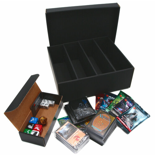 В набор входит: - Коробка для картотеки, рассчитана на хранение 3000 карт без протекторов или 2000 в протекторах - случайный код для Magic: The Gathering Arena, 6 бустеров в электронной версии игры - 5 случайных драфт-бустеров на русском языке - 80 базовых земель (16 карт каждого цвета) - 100 случайных обычных карт - 50 случайных необычных карт - 100 Протекторов для карт MTGTRADE Jace Art 66х91 мм - 5 разноцветных дайс-токенов - d20 счётчик жизней - 5 кубиков выносливости