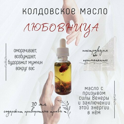 Это масло, которое должна попробовать каждая, т. к. оно не только на мужчин действует, оно еще и помогает укрепить внутреннюю уверенность в себе. Оморачивает, возбуждает, будоражит мужчин вокруг вас своим манящим шлейфом. Притягивает внимание, тела, мысли, помыслы. Мужчины плавятся при вашем присутствии, обнажая своё сексуальное желание и желание угодить вам. Содержит в своем составе цветы и травы, в том числе приворотные травы, эфир жасмина, гвоздики, камень страсти - гранат. Выполняется в день Венеры - день любви, пятницу. Масло потоковое, с призывом силы Венеры и заключении этой энергии в нём.
