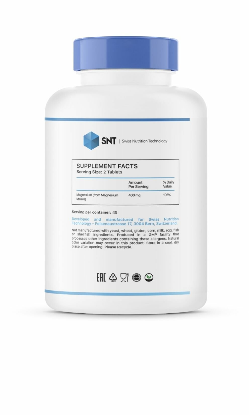 В одной порции (2 таблетки): Магний (как магния малат) 400 мг Другие ингредиенты: Мальтодекстрин, микрокристаллическая целлюлоза, поливинилпирролидон, кремний, растительный стеарат магния, материал оболочки.