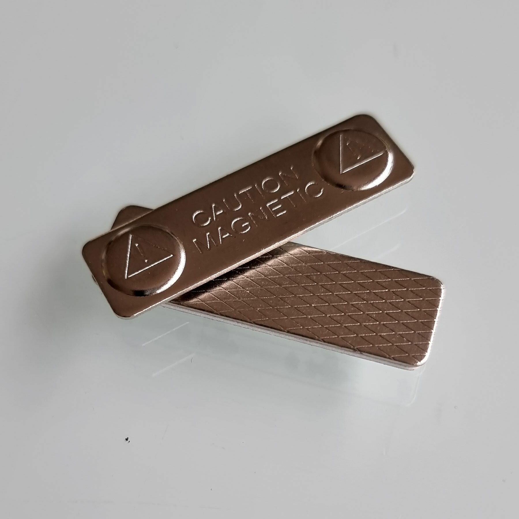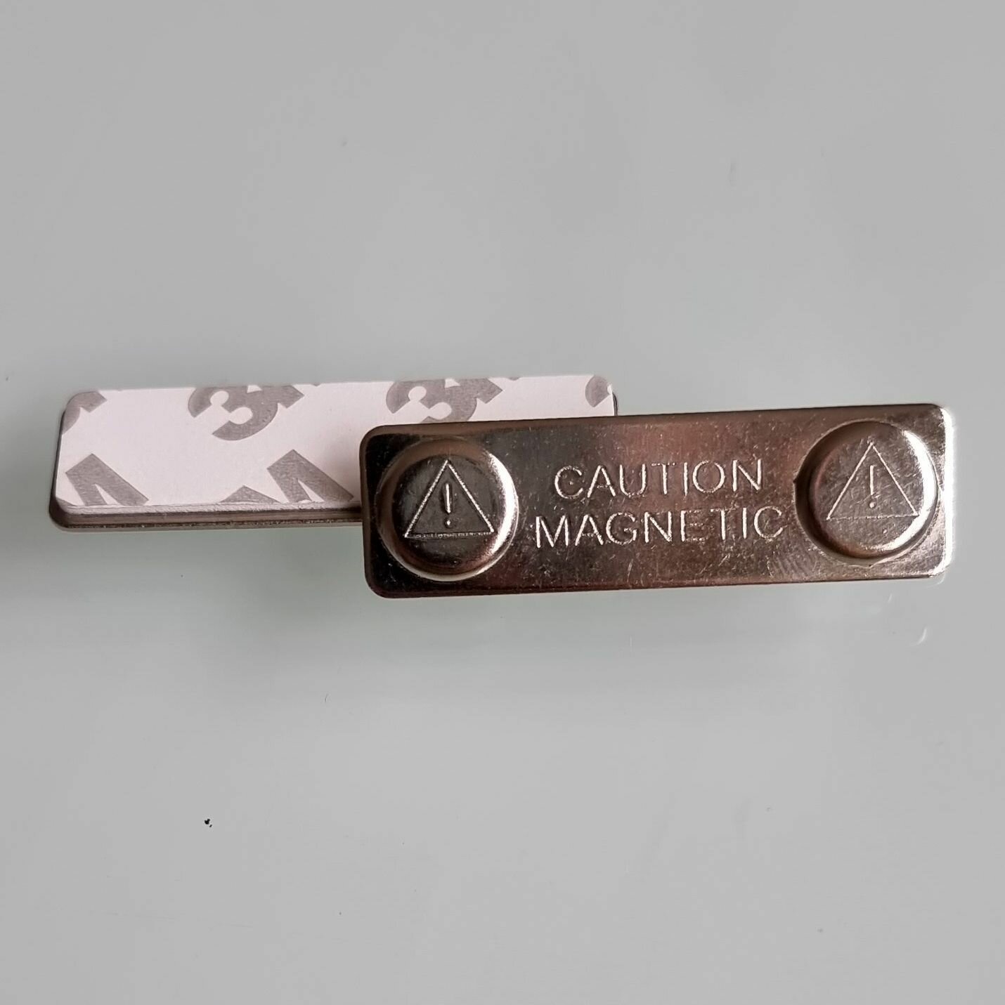 Магнит для бейджа, 45х14 мм, металлическая планка с двумя магнитами и ответная часть со скотчем 3М, которая наклеивается на бейдж. Перед крепление поверхность бейджа рекомендуется обезжиривать для лучшего сцепления клейкой поверхности с бейджем. Универсальная, подходит для пластиковых, металлических, деревянных, акриловых, пластиковых и других видов бейджей. Имеет очень прочное магнитное крепление, не портит одежду.