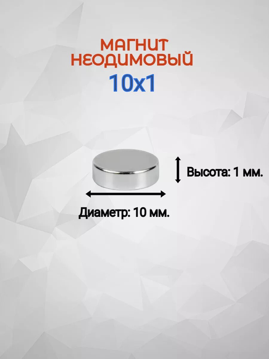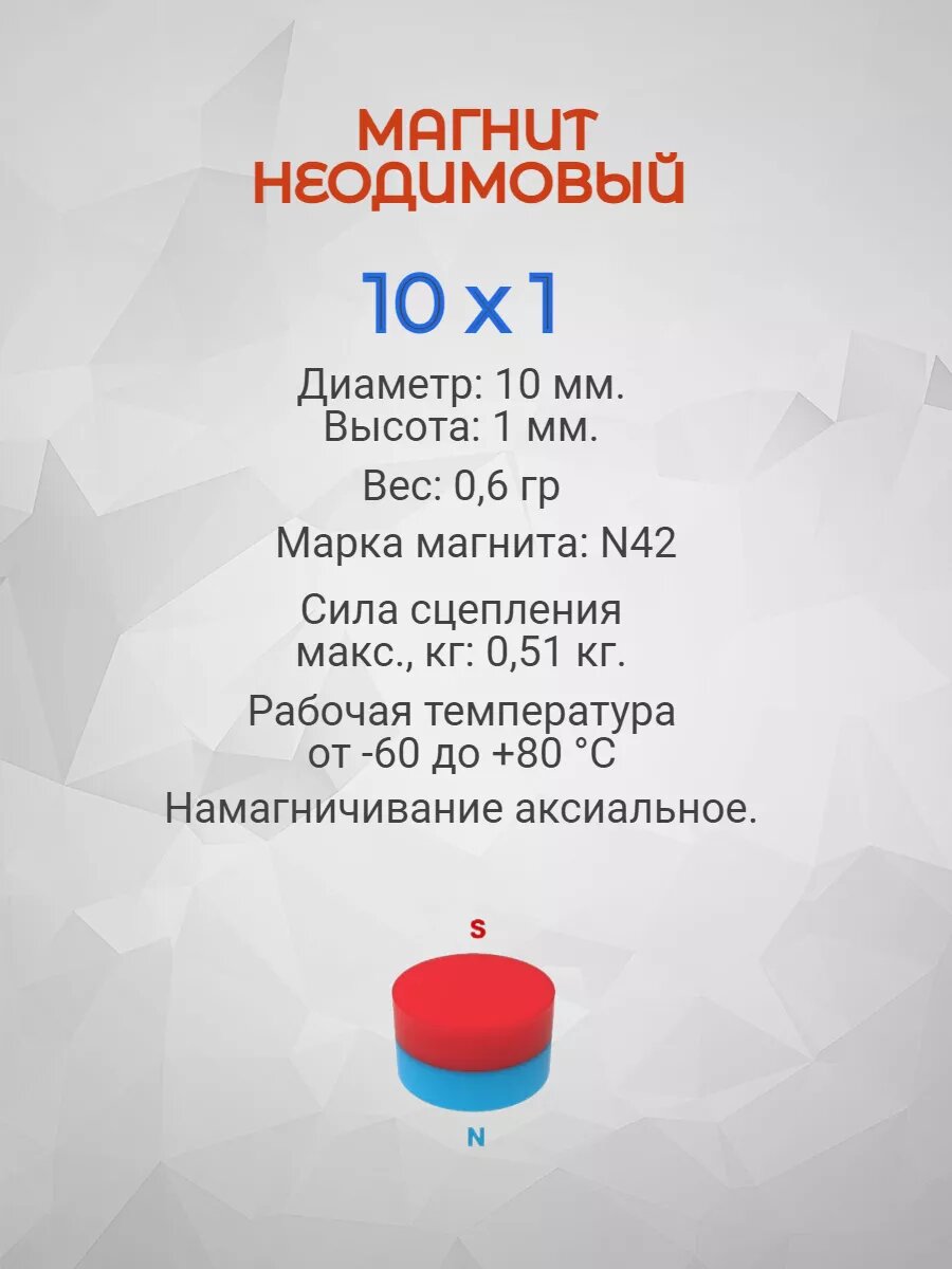 Диаметр - 10 мм Высота - 1 мм Марка магнита N42 Магнитные свойства постоянного магнита 10х1: Br > 1.21 T; Hcb > 899 kA/m; Hcj > 955 kA/mBH)max > 287 kJ/m3; Tw < +80°С Максимальная рабочая температура + 80 °С Намагничивание аксиальное Сила сцепления ~ 0,5 кг Вес магнита 10х1 ~ 0,6 гр Страна изготовитель - Китай