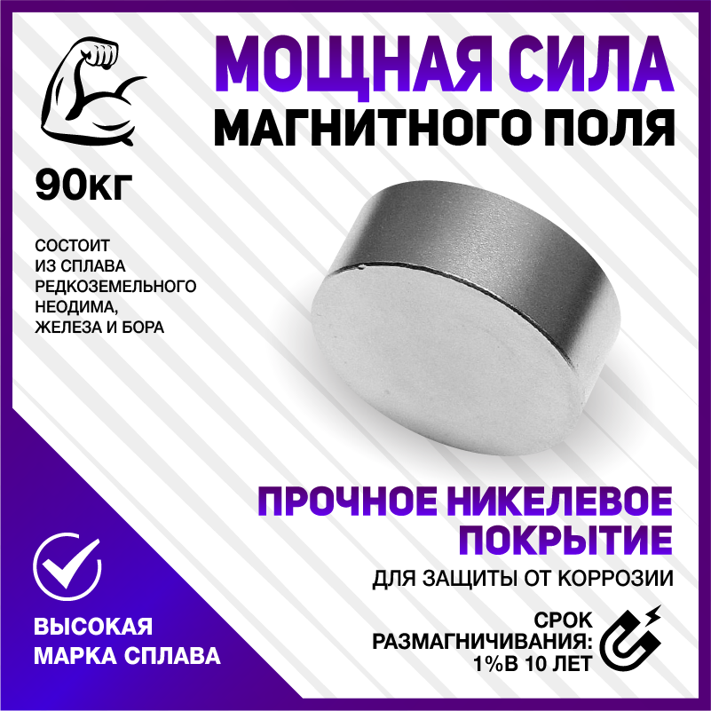 Постоянный магнит 45х20 мм имеет силу сцепления 90 кг, относительно небольшой вес 215 грамм и неплохие возможности как в быту, так и в промышленной отрасли. Если используете сразу 2 или более магнита, держите магниты на расстоянии друг от друга во избежания повреждения магнитов и пальцев. Данный сплав дает магниту высокую мощность и долговечность, размагничивание всего 1 процент в 10 лет, класс постоянных магнитов славится как - класс вечных магнитов, данное приобретение будет служить долгие годы.