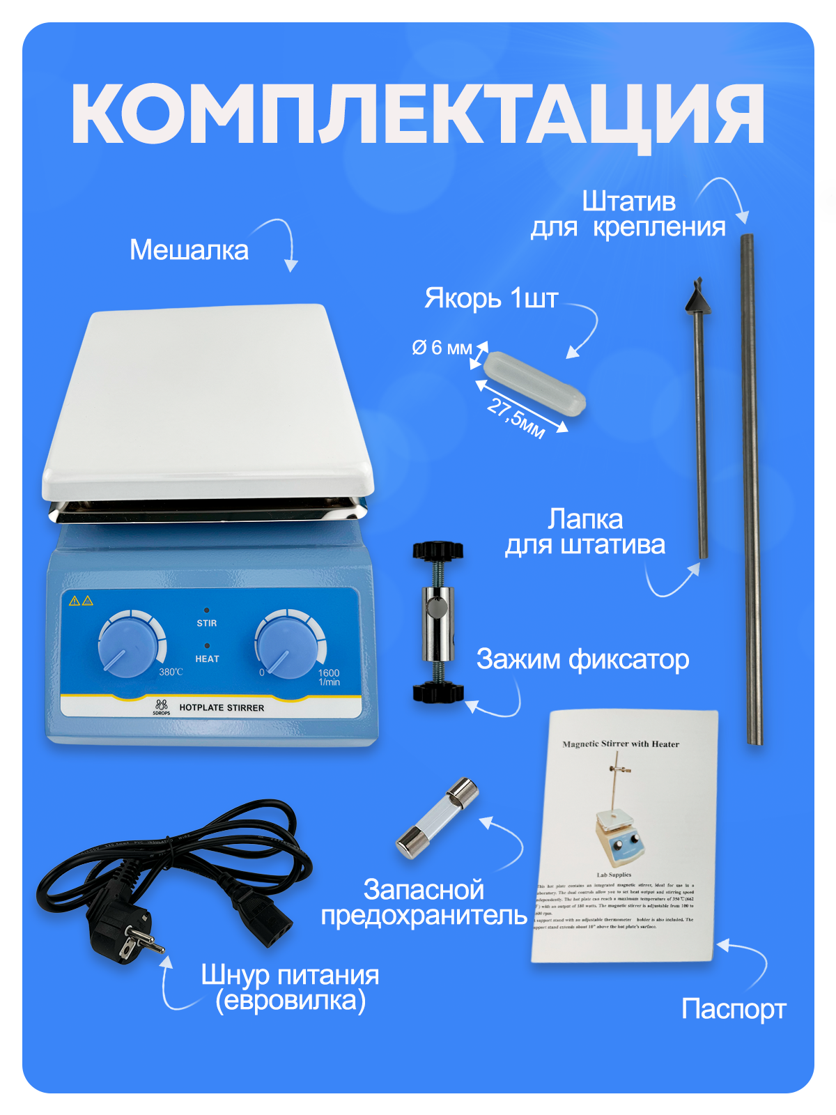 | Подробная комплектация | Магнитная мешалка - 1 шт; Перемешивающий якорь - 1шт |