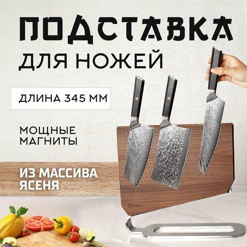 Настольная двухсторонняя деревянная подставка для ножей Keemake BL-1 станет незаменимым элементом вашего кухонного интерьера. Эта подставка под ножи объединила в себе высококачественные материалы, продуманный дизайн и мощную магнитную фиксацию. Высококачественные материалы Подставка для ножей кухонных Keemake BL-1 выполнена из массива ясеня. Ясень известен своей высокой прочностью и устойчивостью к механическим повреждениям, что наделяет товары для кухни длительным сроком службы. Более того, данный вид древесины обладает хорошей устойчивостью к влаге и не требует дополнительного ухода. Эстетические качества ясеня также на высоте: натуральный рисунок древесины создает уникальный, теплый и уютный вид. Благодаря этому, подставка для приборов гармонично впишется в любой интерьер. Магнитный держатель ножей покрыт бесцветным нитроцеллюлозным лаком, который не только подчеркивает красоту натурального дерева, но и обеспечивает дополнительную защиту от внешних воздействий. Надежная конструкция Металлическая ножка, которую имеет подставка для кухонных принадлежностей, выполнена из нержавеющей стали марки 430, что даёт дополнительную устойчивость и надежность. Надежная опора и сбалансированное распределение веса держатель для столовых приборов максимальной безопасностью использования. Вы можете быть уверены, что ваши ножи будут надежно фиксированы и всегда под рукой. Мощная магнитная фиксация Подставка для ножей деревянная Keemake BL-1 с каждой стороны оснащена мощными ферритовыми магнитами, обладающими силой более 900 гаусс. Это позволяет надежно удерживать до 13 ножей различного типа и размера. Двусторонняя магнитная поверхность обеспечивает принадлежности для кухни удобством использования и хранения ножей, делая их доступными сразу с обеих сторон. Эстетика и функциональность Магнитная подставка для ножей и кухонных принадлежностей Keemake BL-1 отличается не только функциональностью, но и стильным дизайном. Деревянная подставка станет настоящим украшением вашей кухни, превратив ее в уютное и элегантное пространство. Вы можете быть уверены, что эта подставка под ножи не только упростит процесс готовки, но и добавит эстетической привлекательности вашему кухонному интерьеру. Если доска магнитная для ножей BL-1 – это ваш выбор, вы получите не только красивый и стильный элемент декора, но и функциональный инструмент для хранения. Подставка деревянная от Keemake отличается высококачественными материалами, мощными магнитами и надежной конструкцией, благодаря чему эта кухонная утварь имеет особую долговечность и безопасность использования. Вам больше не придется искать нужный нож в ящике или беспокоиться о том, что ножи могут повредиться или повредить что-то другое на вашей кухне. Ваши ножи будут всегда на виду и в легкой доступности. Кроме того, держатель ножей магнитный от Keemake из ясеня придаст вашей кухне природную эстетику, делая её еще уютнее и привлекательнее. Подставка под приборы Keemake BL-1 – это не просто практичный аксессуар, а надежное и уникальное сочетание стиля и функциональности. Общая информация: • Название: Магнитная подставка с металлической ножной • Бренд: Keemake • Модель: BL-1 • Цвет: ясень • Тип подставки: настольная, двухсторонняя • Особенности: магнитная подставка из дерева, массив ясеня, натуральное дерево, ферритов