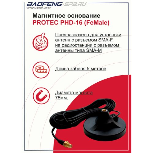 Магнитное основание Protec PHD-16 SMA-F для установки антенн с разъемом SMA-F (SMA-FeMale) на радиостанции с разъемом антенны типа SMA-M (SMA-Male). Предназначено для установки на поверхность крышу автомобиля с антенной портативной радиостанции с диапазонами VHF 136-174 и UHF 400-470 Мгц. Магнитное основание наиболее совместимо с антенной Protec PHD-771 SMA-F (SMA-FeMale). Длина кабеля 5 метров.