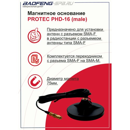 Магнитное основание PHD-16 SMA-M для установки антенн с разъемом SMA-F (SMA-FeMale) в радиостанции с разъемеом антенны типа SMA-F (SMA-FeMale). Комплектуется переходником с разъема SMA-F на SMA-M. Предназначено для установки на поверхность крышу автомобиля с антенной портативной рации с диапазонами VHF 136-174 и UHF 400-470 Мгц. Магнитное основание наиболее совместимо с антенной Protec PHD-771 SMA-F. Длина кабеля 5м.