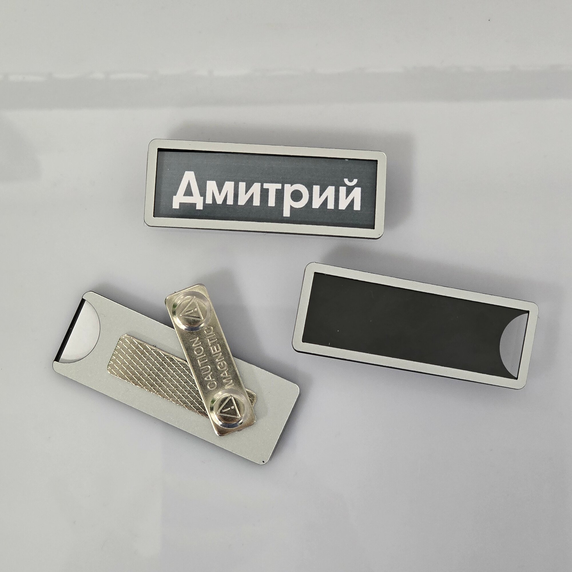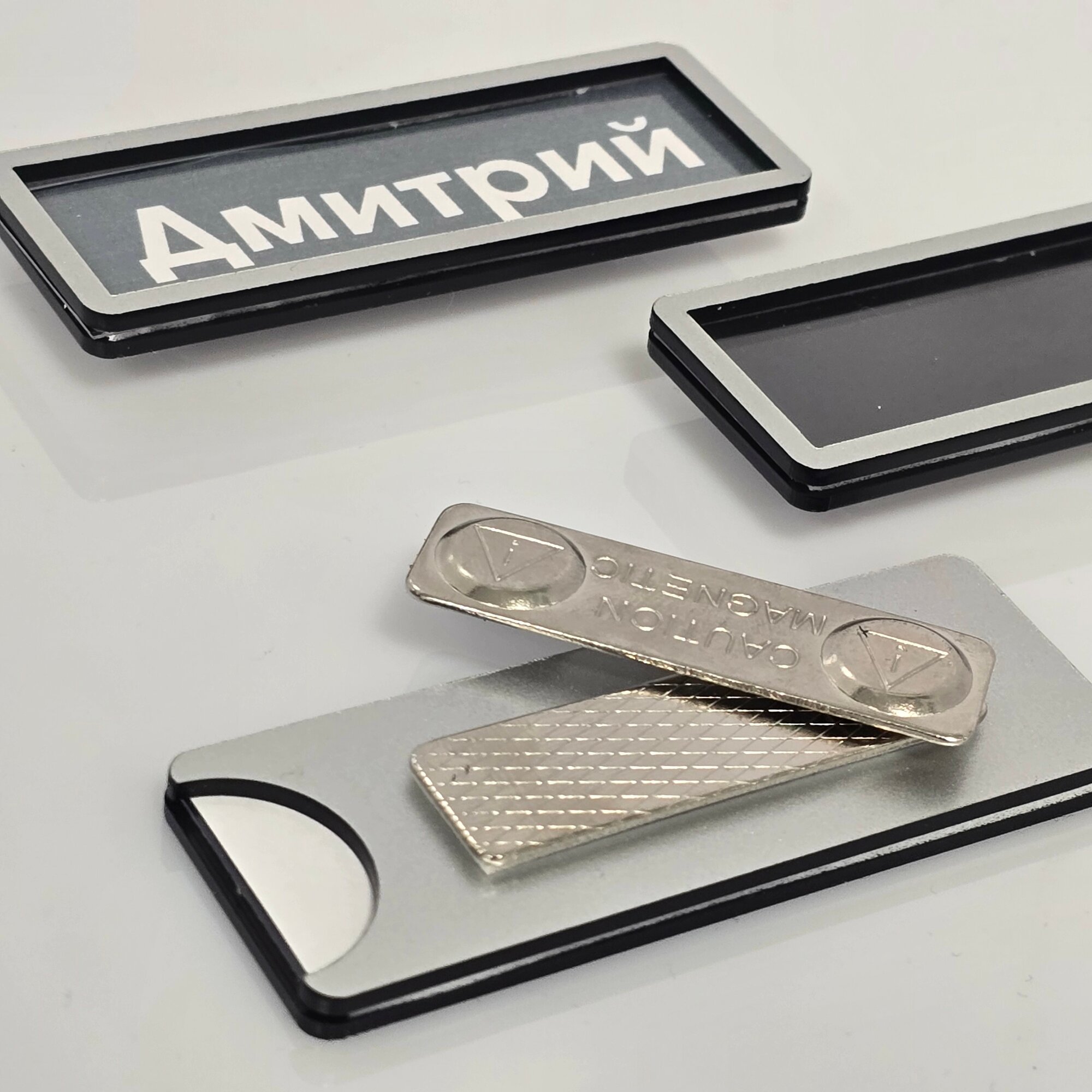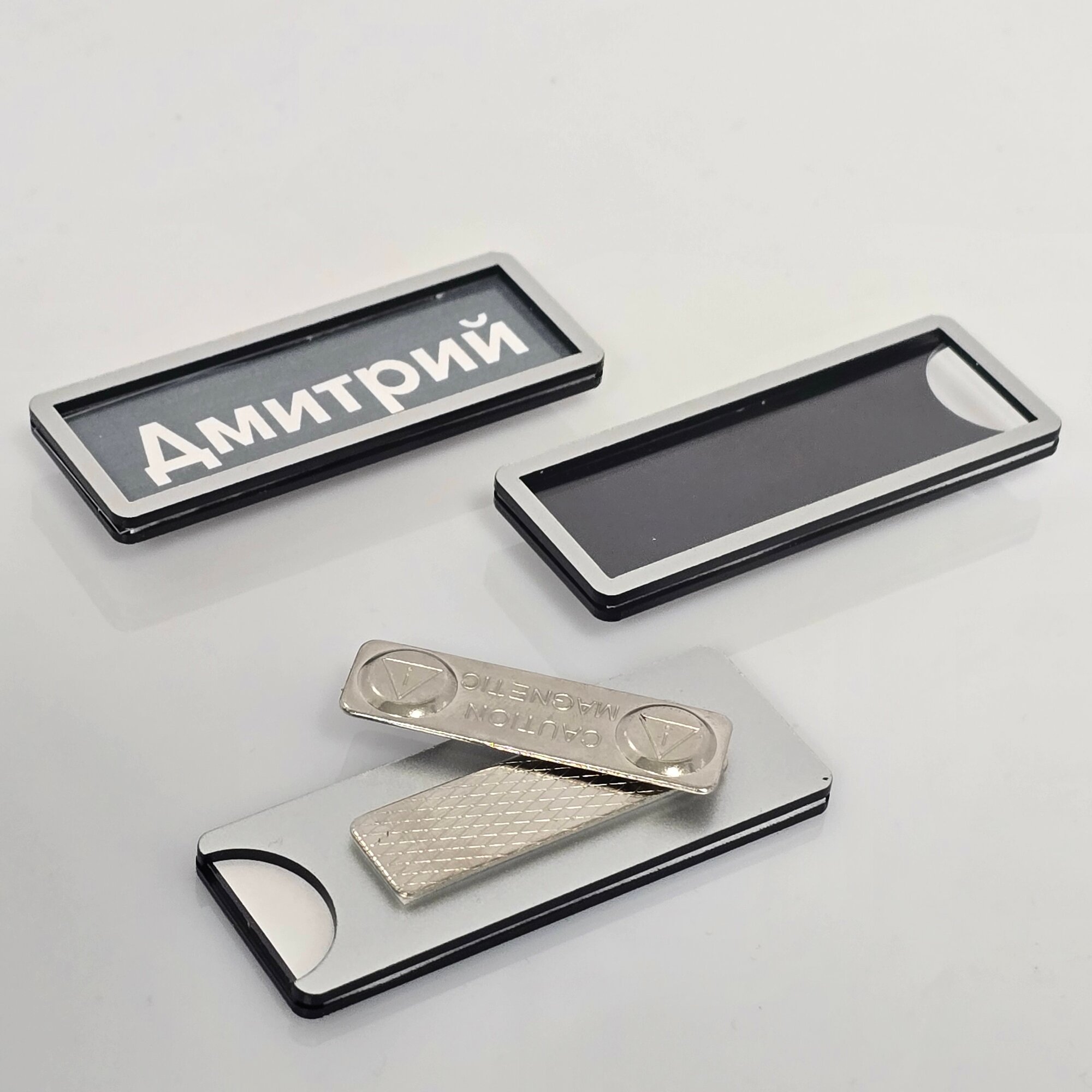 Магнитные бейджи с вкладышем размером 72х27мм, идеально подходят для использования в офисе, на выставках и мероприятиях. В комплекте каждый бейдж оснащён магнитом для удобного крепления к одежде, что исключает повреждение ткани.