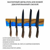 Магнитный держатель для ножей из орехового дерева и эпоксидной смолы - это не только функциональный аксессуар для вашей кухни, но и настоящее произведение искусства. Изготовленный из натурального дерева ореха с применением заливки эпоксидной смолой, каждый держатель является уникальным и неповторимым.