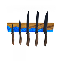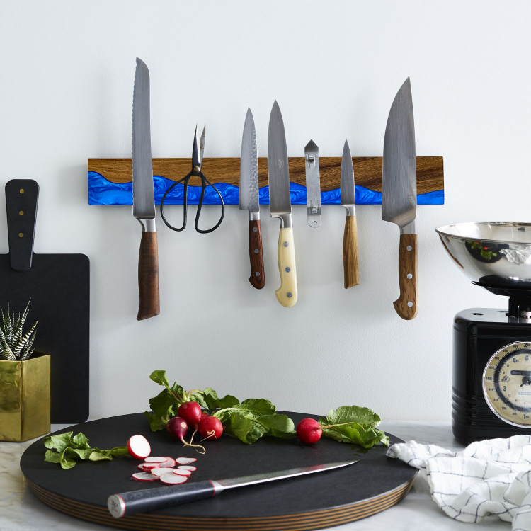Комбинация теплого оттенка орехового дерева и прозрачной эпоксидной смолы создает эффектный контраст, который привлекает взгляды и добавляет элегантности в вашу кухню. Каждый держатель имеет магнитную полосу, которая надежно удерживает ваши ножи, обеспечивая безопасное и удобное хранение.
