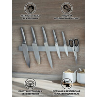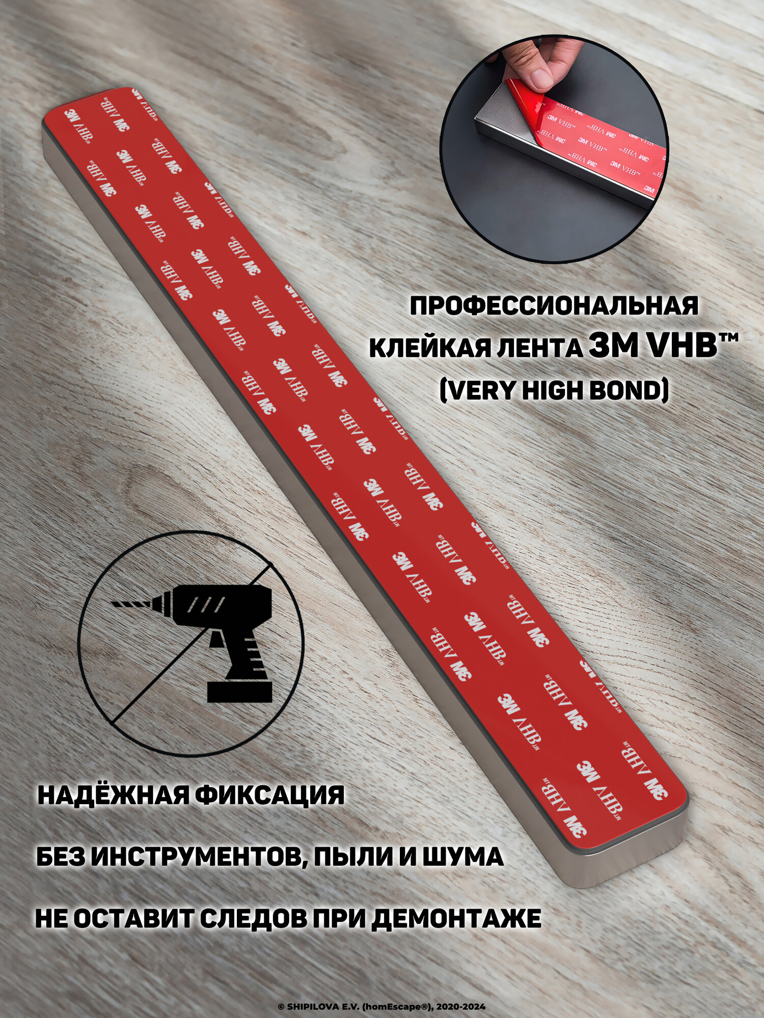 Магнитный держатель премиум класса homEscape® — идеальная альтернатива обычной подставке для ножей. Особенностью данного держателя является простое и надежное крепление к стене на профессиональную клейкую ленту 3М VHB (без помощи инструментов), а также использование неодимовых супермагнитов, которые в отличии от ферритовых характеризуются более высокой силой сцепления, легкостью и долговечностью. Держатель позволит Вам сэкономить пространство рабочей зоны, а также сохранить лезвия ножей в хорошем состоянии, так как они не соприкасаются друг с другом. Держатель изготовлен из нержавеющей стали марки AISI 304, устойчив к коррозии, повышенным температурам и химически активным веществам. Стильный дизайн добавит акцент в интерьер Вашей кухни, а простота ухода и долговечность изделия оставят самые лучшие впечатления от использования.