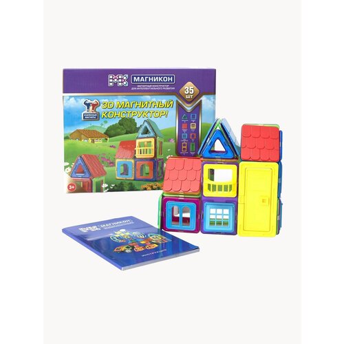 Магнитный конструктор Магникон МК-35 состоит из 21 полноразмерных деталей с усиленными магнитами и 14 пластиковыми деталями-вставками с фиксаторами Состав набора: прямоугольник 2 шт, треугольник 2 шт, квадрат 17 шт, элементы крыши 6 шт, балкон 1 шт, фасадная дверца 1 шт, окно (открывается) 2 шт, окно 4 шт. Размер квадрата 6,5х6,5 см, размер прямоугольника 13х6,5 см, размер треугольника 5,5х5,5 см, размер. В комплект входит Книга идей со схемами построек разной сложности от начально до продвинутого уровня. Конструктор находится в защитном блистере и упакован в яркую подарочную коробку из плотного картона. Магнитный конструктор Магникон - это уникальная развивающая игрушка, которая не оставит равнодушным ни одного ребенка, это конструктор для малышей, конструктор для мальчиков, конструктор для девочек. Конструктор для детей 2 лет, 3 лет, 4 лет, 5 лет, 6 лет Магникон подходит для обучающих игр в поездке и отпуске. Детские игрушки Магникон отличается от привычных конструкторов тем, что его детали легко соединяются между собой силой магнитного притяжения. Конструктор для самых маленьких деток состоит из пластиковых деталей различных геометрических форм и встроенных в них магнитов. Магниты, в свою очередь, свободно вращаются внутри пластика и поворачиваются друг к другу нужным полюсом, поэтому всегда притягиваются. Есть одна особенность, которая недоступна другим конструкторам – это то, что все элементы соединяются друг с другом под разным углом, что позволяет создавать уникальные потрясающие конструкции. В процессе конструирования малыш воочию изучает свойства магнита, математику, развивает мелкую моторику, строительные навыки, пространственное мышление, логику и интеллект. Только у детского конструктора Магникон детали с усиленными магнитами, из которых можно строить крепкие большие постройки, брать их в руки и играть ими. Развивающий конструктор займет ребенка надолго, на час или даже на целый день. В конструктор МК Магникон интересно играть как одному, так и вместе со всей семьей. Поэтому Магникон покупают не только домой, но и в учебные и развивающие центры, в детские сады и школы в качестве развивающей игры. Конструктор сделан так, что магниты надежно запаяны внутри деталей. Магнитные детали достаточно большие, у них нет острых углов, детали сделаны из сверхпрочного пластика, их сложно сломать. Поэтому игрушка безопасна для ребенка. С помощью пластикового конструктора для малышей можно создавать различные модели и магнитные фигуры, такие как игрушки для малышей и игрушки для детей ракета, кукольный домик, динозавр, карусель, машинка для мальчика 2 лет, 3 лет, 4 лет, 5 лет, 6 лет или робот, колесо обозрения, замок принцессы, рыбка. Магнитный 3d конструктор - это игрушка для мальчиков и игрушка для девочек, развивающая игра для дома и в детском саду. Магнитные детали разноцветные их можно раскладывать по цветам и использовать как сортер. Конструктор с магнитами может использоваться в качестве бизиборда, который занимает ребенка на длительное время, развивая его умственные способности. Игровой набор Магникон подходит для самостоятельного игрового процесса, а также для совместной игры с друзьями или родителями. Магнитный 3Д конструктор - отличный выбор конструктора для малышей, которые только начинают знакомиться с миром конструирования и разв
