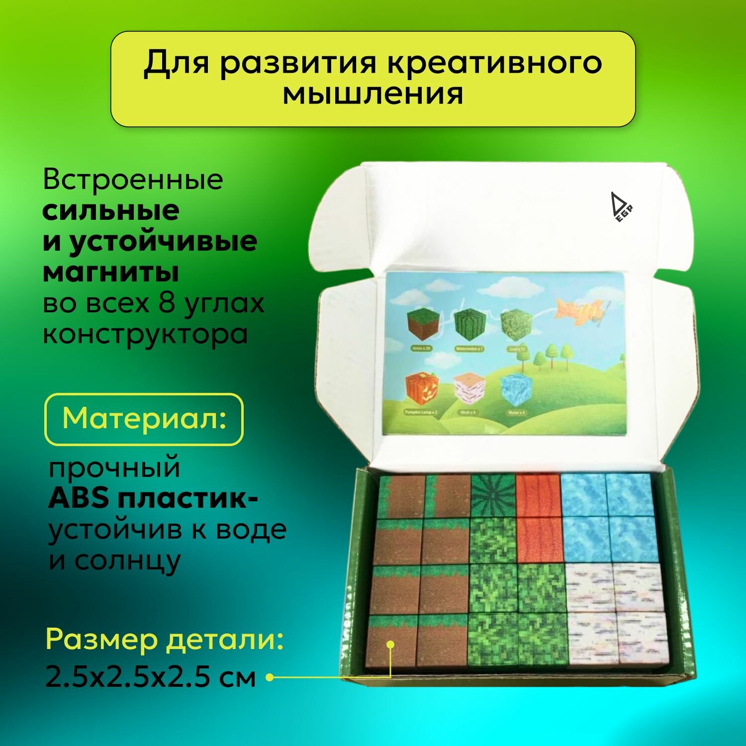 Каждый кубик выполнен с особым вниманием к деталям и полностью соответствует внешнему виду блоков из популярной игры. Благодаря магнитному конструктору, ребенок сможет самостоятельно создавать собственные истории и приключения в мире Minecraft. Конструктор также может стать оригинальным украшением на полках. В подарок с конструктором Magnetic Blocks World идёт фигурка персонажа из игры.
