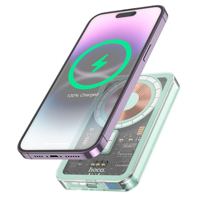 Магнитный беспроводной Power Bank Magsafe Hoco Q14 легко фиксируется на iPhone и быстро заряжает гаджет. Портативное зарядное устройство – идеальное решение, когда рядом нет проводной зарядки и розетки, заряжать смартфон с помощью пауэрбанка можно прямо на ходу. Компактный внешний аккумулятор с мощными встроенными магнитами подходит для iPhone с функцией Magsafe (iPhone 12 и выше), а также для iPhone в чехле с магнитом Magsafe (iPhone 8 и выше). Power Bank также совместим с AirPods и любыми другими устройствами, которые поддерживают беспроводную зарядку – с ними зарядное устройство будет работать без фиксации на корпусе. Беспроводная зарядка для iPhone плотно фиксируется на смартфоне в нужном положении и автоматически начинает заряжать устройство. Магнитный Power Bank можно взять с собой куда угодно, благодаря небольшим габаритам внешний аккумулятор поместится в карман и маленькую сумочку. Беспроводной пауэрбанк не перегревается и не влияет на состояние батареи смартфона. Аксессуар можно взять с собой в самолет, так как он соответствует стандартам авиационной безопасности. Магнитный Power Bank Magsafe заряжается с помощью кабеля Type-C (идет в комплекте). Емкость: 5000mAh / 19Wh. Номинальная емкость: 3000 mAh. Вход: Type-C – 18W (для QC / для FCP / для AFC). Выход: Type-C – 20W (для PD / для QC / для FCP / для AFC). Выход беспроводной зарядки – 5W / 7.5W / 10W / 15W (MagSafe беспроводной выход 7.5W). Общий выход – 5V / 2A. Материал: PC+ABS огнеупорный + литий-полимерная батарея. Размер: 105 x 67 x 12 мм. Вес: 147 г. Совместимость: iPhone 8, iPhone 8 Plus, iPhone X, iPhone XR, iPhone XS Max, iPhone XS, iPhone 11, iPhone 11 Pro Max, iPhone 11 Pro, iPhone SE 2020, 2022 (в чехле с магнитом Magsafe) / iPhone 12 mini, iPhone 12, iPhone 12 Pro, iPhone 12 Pro Max, iPhone 13 mini, iPhone 13, iPhone 13 Pro, iPhone 13 Pro Max, iPhone 14, iPhone 14 Plus, iPhone 14 Pro, iPhone 14 Pro Max / AirPods в кейсе, поддерживающем беспроводную зарядку.