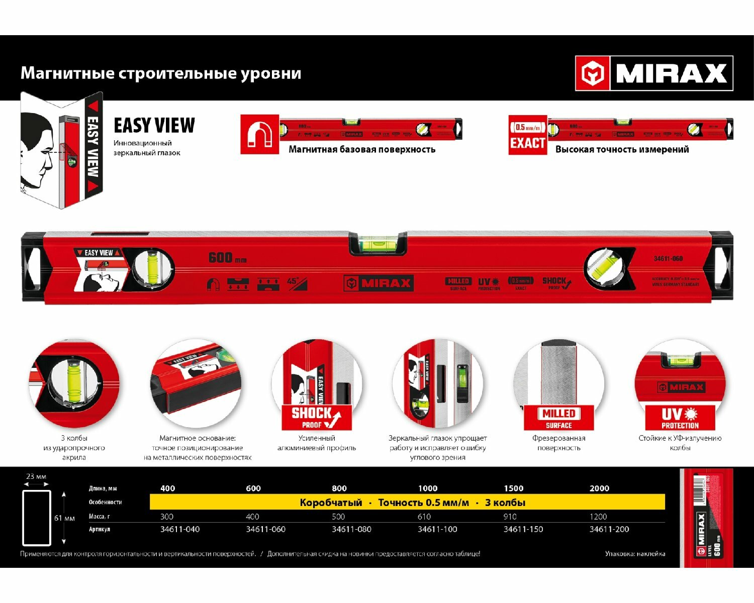 Купить Магнитный строительный уровень MIRAX 2000 мм (34611-200) с доставкой по всей России. Магнитный строительный уровень MIRAX 2000 мм (34611-200): сравнение цен, характеристики, фото, актуальное наличие и цены.