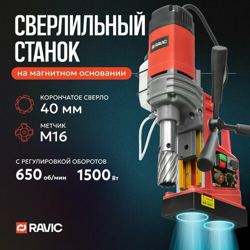 Магнитный сверлильный станок Ravic KMD-40. 1500 Вт, 650 об/мин, диаметр спиральных свёрл 16 мм, корончатых сверл 40 мм, нарезание резьбы до М16: сравнение цен, характеристики, фото, актуальное наличие и цены.