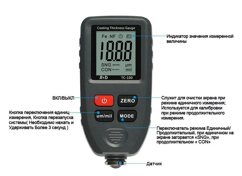 Купить Толщиномер R&D TC100 измеритель толщины лакокрасочного покрытия автомобиля с доставкой по всей России.