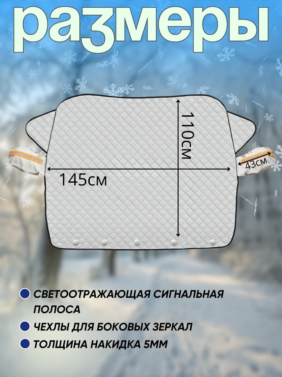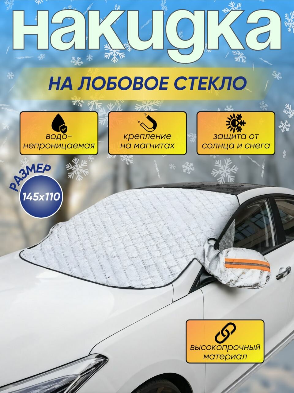 Магнитный чехол для машины от снега / солнца обеспечивает защиту от солнца или от охлаждения автомобиля внутри. Прекрасный вариант автошторки от солнца. Накидка на машину от снега изготовлена из высококачественного материала. В отличии от накидки на панель авто, которая защищает только панель от нагревания, чехол на лобовое стекло защитит лобовое стекло от наледи и снега, а также от прямых солнечных лучей. Использовать данный аксессуар можно в любое время года и при всепогодных условиях как чехол на автомобиль от снега, шторку от солнца. Чехол на автомобиль не примерзает к стеклу. Накидка на лобовое стекло легко устанавливается – боковые детали заправляются в салон автомобиля и прижимается передними дверьми. Так называемые уши одеваются на боковые зеркала. Материал: алюминиевая фольга, хлопок и полиэфирная тафта.