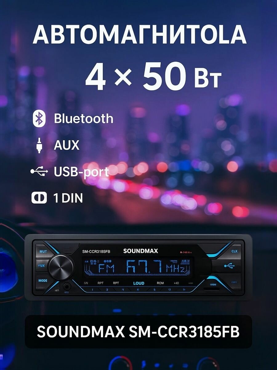 Магнитола для авто с блютуз, Soundmax SM-CCR3185FB, 1-DIN, ISO-разъем, Эквалайзер, FM-тюнер, Функция Hands-free, Черный: сравнение цен, характеристики, фото, актуальное наличие и цены.