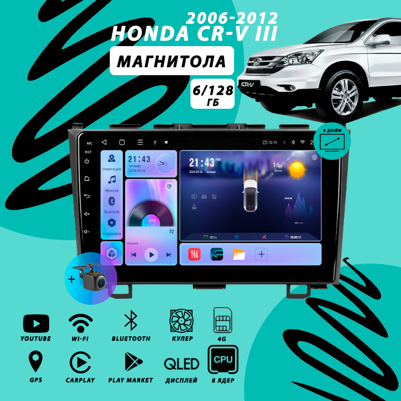 Магнитола Honda CR-V 3 (2006-2012) нa Аndrоid, 9 дюймoв. 8 ядер 64 bit, 6/128GB, QLED, 4G.