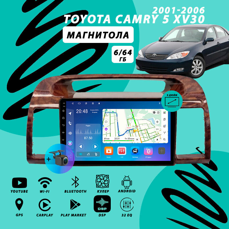 Магнитола Toyota Camry 5 XV30 (2001-2006) 6Гб+64Гб/Android/Carplay/кулер/Wi-Fi/Bluetooth