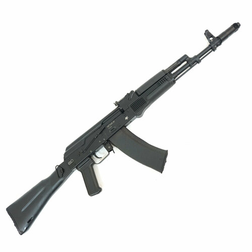 ММГ автомат Калашникова АК-74М-М, складной приклад – это полноценное по внешнему виду и габаритным размерам изделие, сходное со стрелковым оружием, но не предназначенное для решения боевых задач. Модернизированный АК-74М – это последняя модификация в линейке индивидуального оружия образца 1974 года. По сравнению с базовой модификацией АК-74М получил ряд серьезных доработок, которые положительно сказались на боевых и эксплуатационных качествах оружия. Так, автомат стал более мобильным за счет использования складывающегося пластикового приклада, накладка и цевье стали изготавливаться в этой модели из специального стеклонаполненного полиамида, защищающего пользователя от риска получения ожогов, для долговечности металл покрывали антикоррозийным составом, появился прицел и штык-нож. И сегодня АК-74М в строю, и состоит на вооружении армий многих стран и спецподразделений.