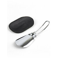 Складной металлический рожок или ложка для обуви в чехле из натуральной кожи, черного цвета. Размер чехла 5 х 8,5 см. Размер рожка 4 х 13 см. (в сложенном состоянии 4 х 7,5 см.) Упакован в фирменную коробку.