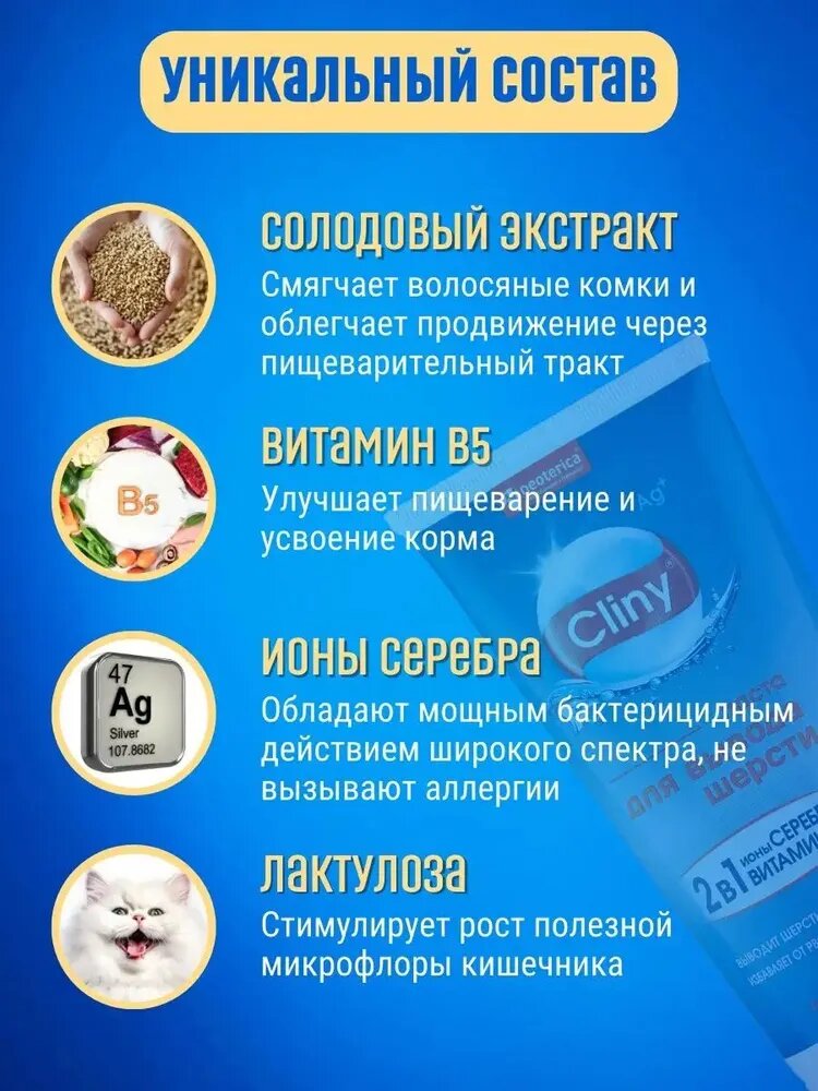 Паста для выведения шерсти CLINY - это кормовая добавка, разработанная специально для домашних животных и птиц. Производится в России и соответствует всем стандартам качества и безопасности.