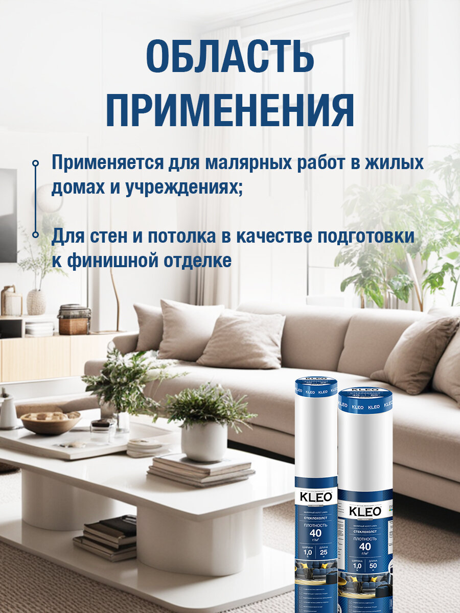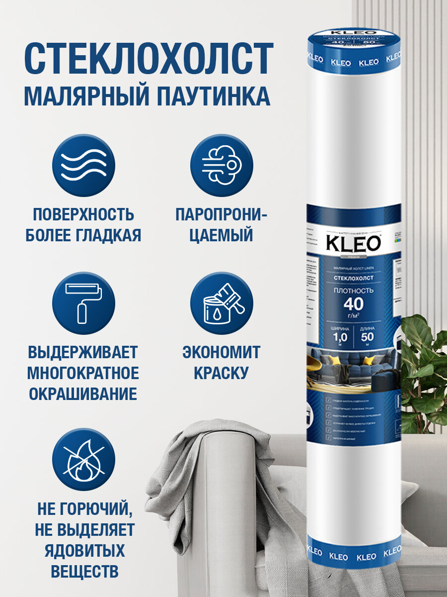 Стеклохолст, в отличие от стеклообоев, представляет собой нетканое полотно, состоящее из спрессованных стеклянных волокон, прочный и экологически чистый строительный материал. Малярный стеклохолст упрощает подготовку поверхностей к покраске, служит защитой от мелких трещин, улучшает финишную отделку. Стеклохолст KLEO LINEN применяется для малярных работ как выравнивающее покрытие незначительных перепадов, рекомендуется под последующее шпатлевание и окрашивание. Малярный стеклохолст предотвращает появление сетевидных трещин при лакокрасочных работах, экономит краску и армирует основание. Идеально подходит для внутренних ремонтных работ и таких оснований как: гипсовые и цементные штукатурки, гипсокартонный лист (ГКЛ), выравнивающие шпаклевки на дисперсионной или минеральной основе. При проведении отделочных работ необходимо использовать средства индивидуальной защиты. После рекомендуется промыть руки и лицо чистой проточной водой. После наклеивания и покрытия несколькими слоями отделочных стройматериалов, стеклохолст является абсолютно безвредным и безопасным. Материал, из которого изготовлено стекловолокно, негорючий, что позволяет использовать его в любых жилых помещениях, включая детские комнаты. А также в школах, детских садах, больницах, магазинах и гостиницах. Стеклохолст не притягивает пыль, не выделяет вредных веществ, пропускает воздух и не создает условий для появления плесени и грибка. Стеклохолст влагостойкий и не реагирует на высокую влажность в помещении, устойчив как к отрицательным, так и к высоким температурам. Удельная плотность стеклохолста KLEO LINEN 35г/м. кв, длина 50м, ширина 1м. Материал полупрозрачного цвета, еще называют строительной паутинкой. В зависимости от степени неровности оклеиваемой поверхности, стеклохолст наклеивается двумя способами: встык или внахлест. Подробная информация в инструкции по применению. Мы рекомендуем использовать клей KLEO ULTRA в сухом или готовом виде. Желаем красивого и легкого ремонта вместе с KLEO!