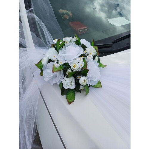 Малый букет с фатином на капот автомобиля (являются частью набора "Белоснежка"), который превратит автомобиль в настоящую карету молодоженов и придаст оригинальности композиции. Малый букет с фатином, сделан из высококачественных материалов, состоит из искусственных головок розы, фатина, мягкой подложки. Крепятся на капот автомобиля с помощью атласных лент и качественных присосок, крепление надежное и гарантировано не испортит покрытие вашего автомобиля. Эти украшения выгодно выделят вас в любой обстановке.