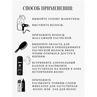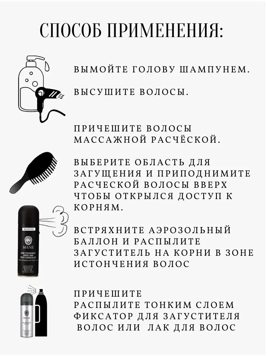 Способ применения: вымойте голову шампунем, воспользуйтесь смываемым кондиционером для волос, высушите волосы. Причешите волосы массажной расческой. Выберите проблемную область и приподнимите расческой волосы вверх, чтобы открылся доступ к корням. Встряхните аэрозольный баллон и распылите загуститель на корни в зоне истончения волос. Дайте волосам высохнуть. После того как волосы полностью высохнут, причешите волосы расческой или уложите волосы пальцами рук. Закрепите лаком для волос.