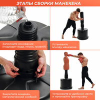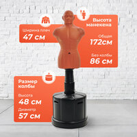 | Дополнительная информация | размер манекена: 49х26х119 см; объем основания: 100 литров (можно засыпать песок, гравий); спина модели защищена, и по ней можно наносить удары; вес основания: 7.5 кг; высота снаряда с основанием: 164 см; диаметр основания: 57 см |