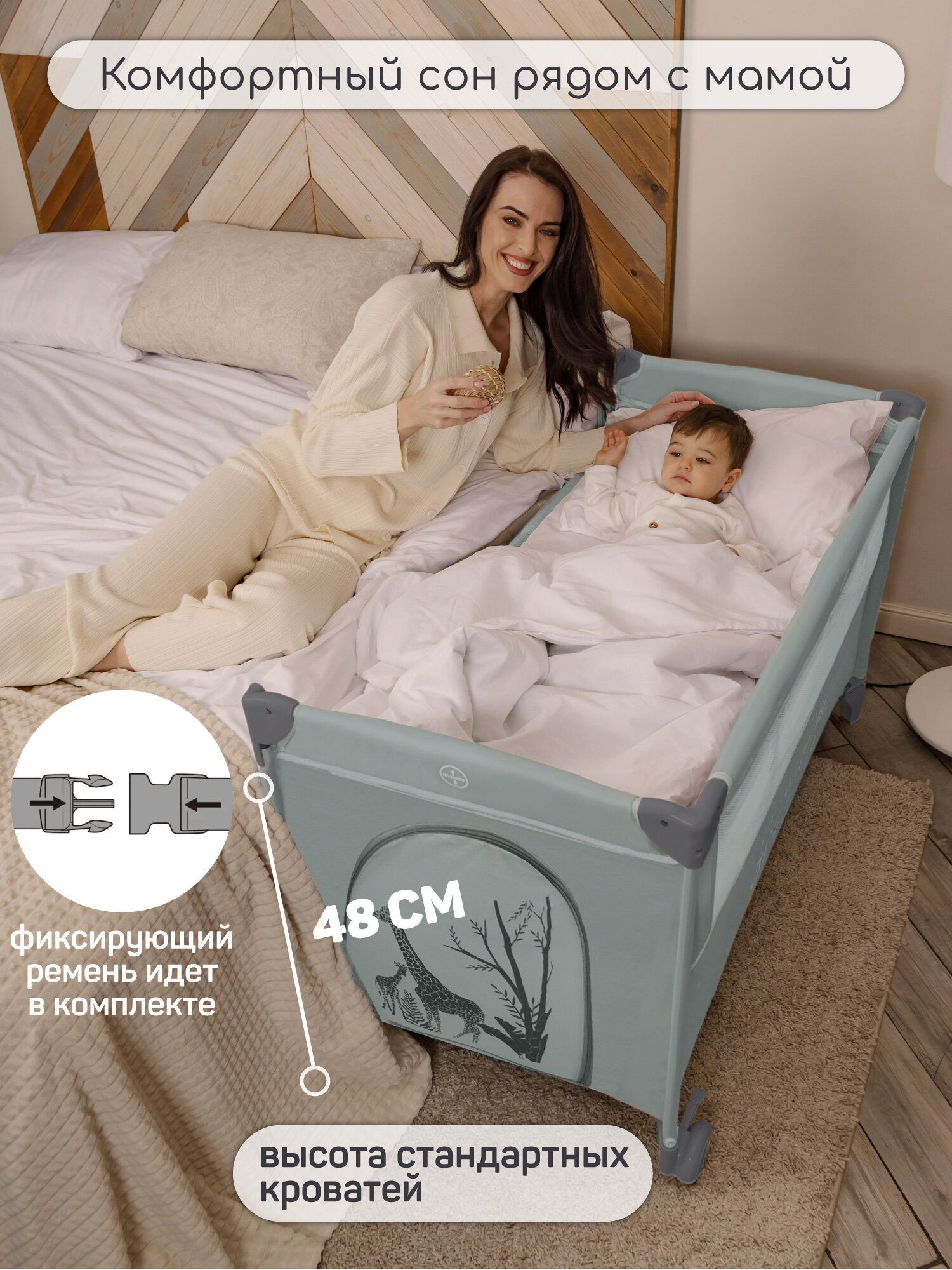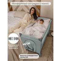 Манеж легко превращается в комфортную приставную кроватку благодаря опускающейся стенке. Это позволяет установить манеж рядом с кроватью родителей, обеспечивая комфорт и безопасность для малыша.