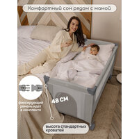 Манеж легко превращается в комфортную приставную кроватку благодаря опускающейся стенке. Это позволяет установить манеж рядом с кроватью родителей, обеспечивая малышу дополнительный комфорт и безопасность.