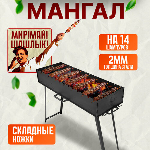 Стенки с дном соединяются специальными замочками, так что корпус не поведет от перегрева. Это делает его отличным выбором для длительных выездов на природу или кемпинг. Толщина стенок мангала на ножках 2 мм.