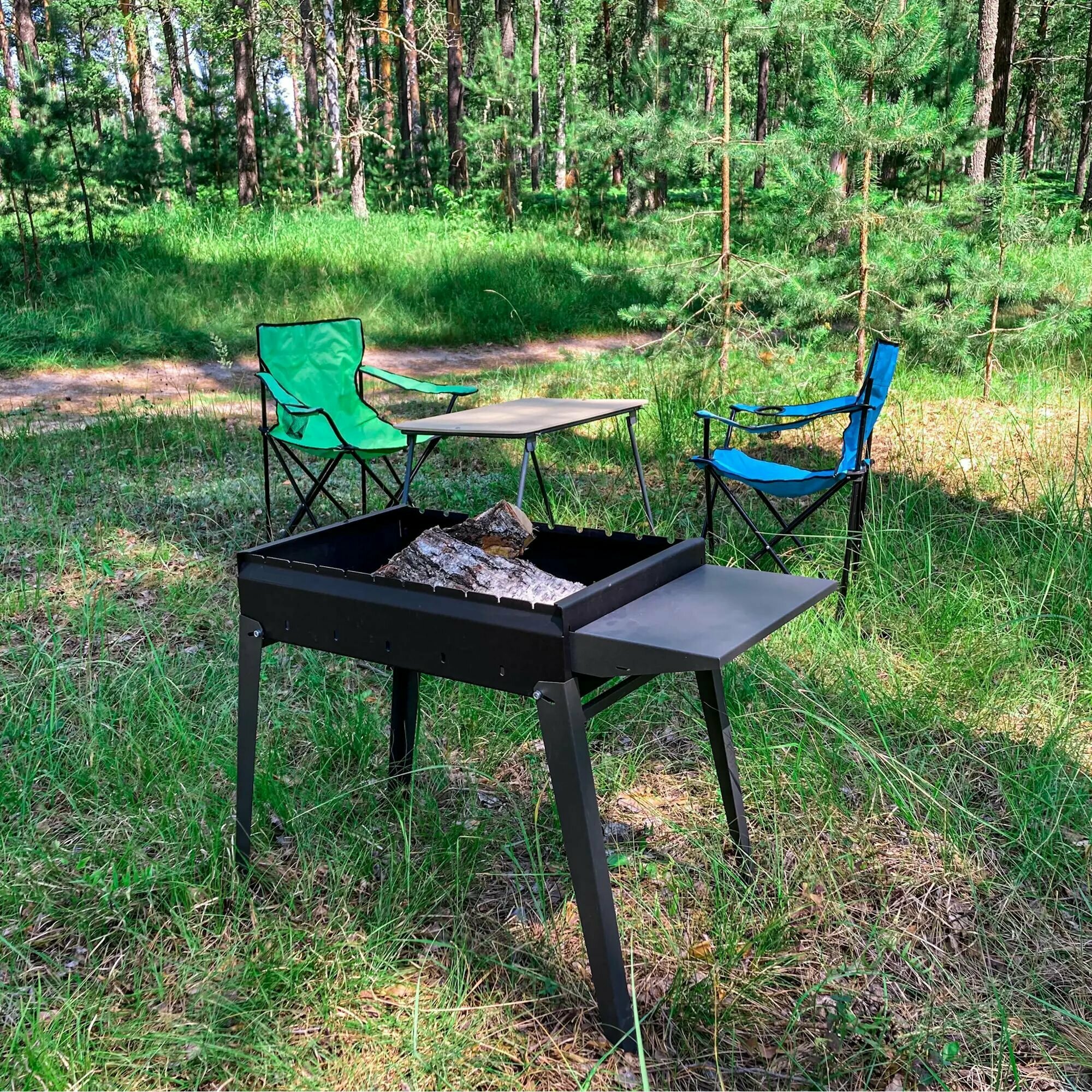 Купить Мангал длиной 85 см и шириной 38 см, со складными ножками и полкой для размещения продуктов, посуды, кухонных аксессуаров. Незаменимая конструкция для пикников и приготовления пищи на даче. с доставкой по всей России.
