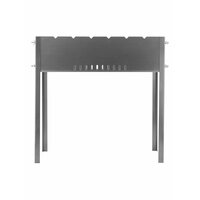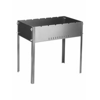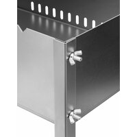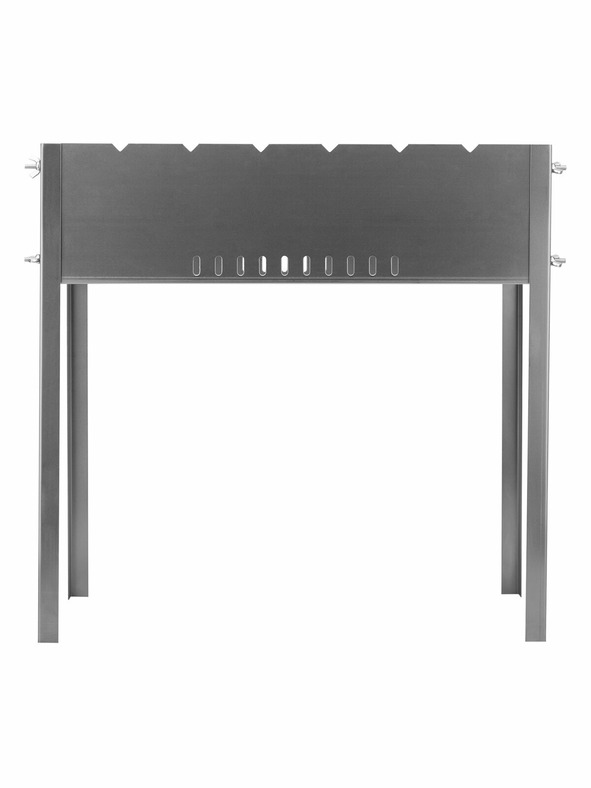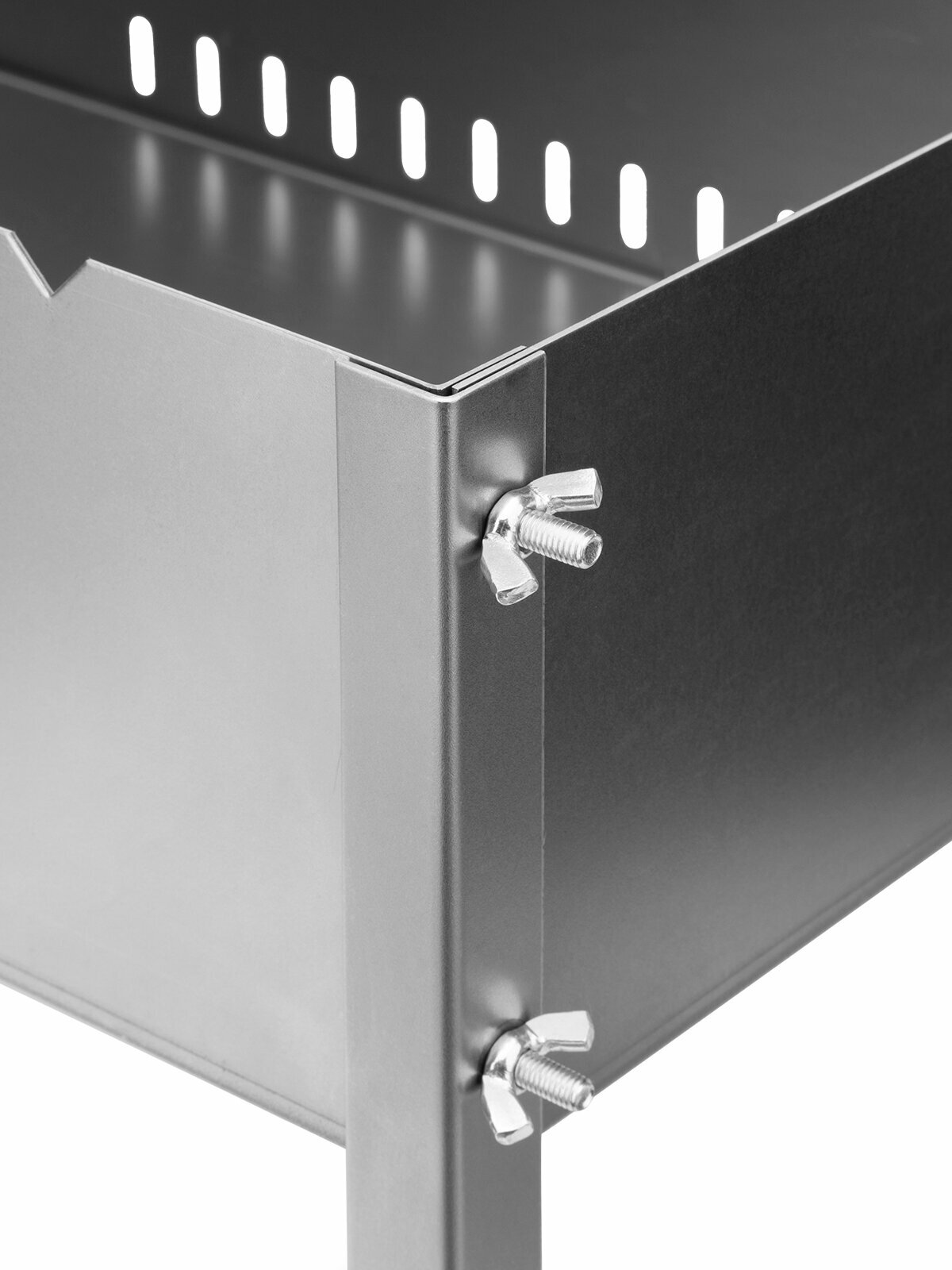 Стенки мангала изготовлены из жаропрочной углеродистой стали толщиной 1,2 мм и хорошо удерживают жар. Поэтому при приготовлении мяса, рыбы и овощей не потребуется большого объема топлива. За счет крепления стенок на гайки-барашки хорошо сохраняет форму и устойчивость. Прорези для поддува создают естественную вентиляцию для раздува угля. Специальные пазы для 8-ми шампуров.