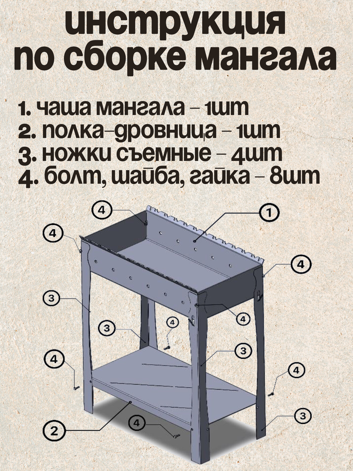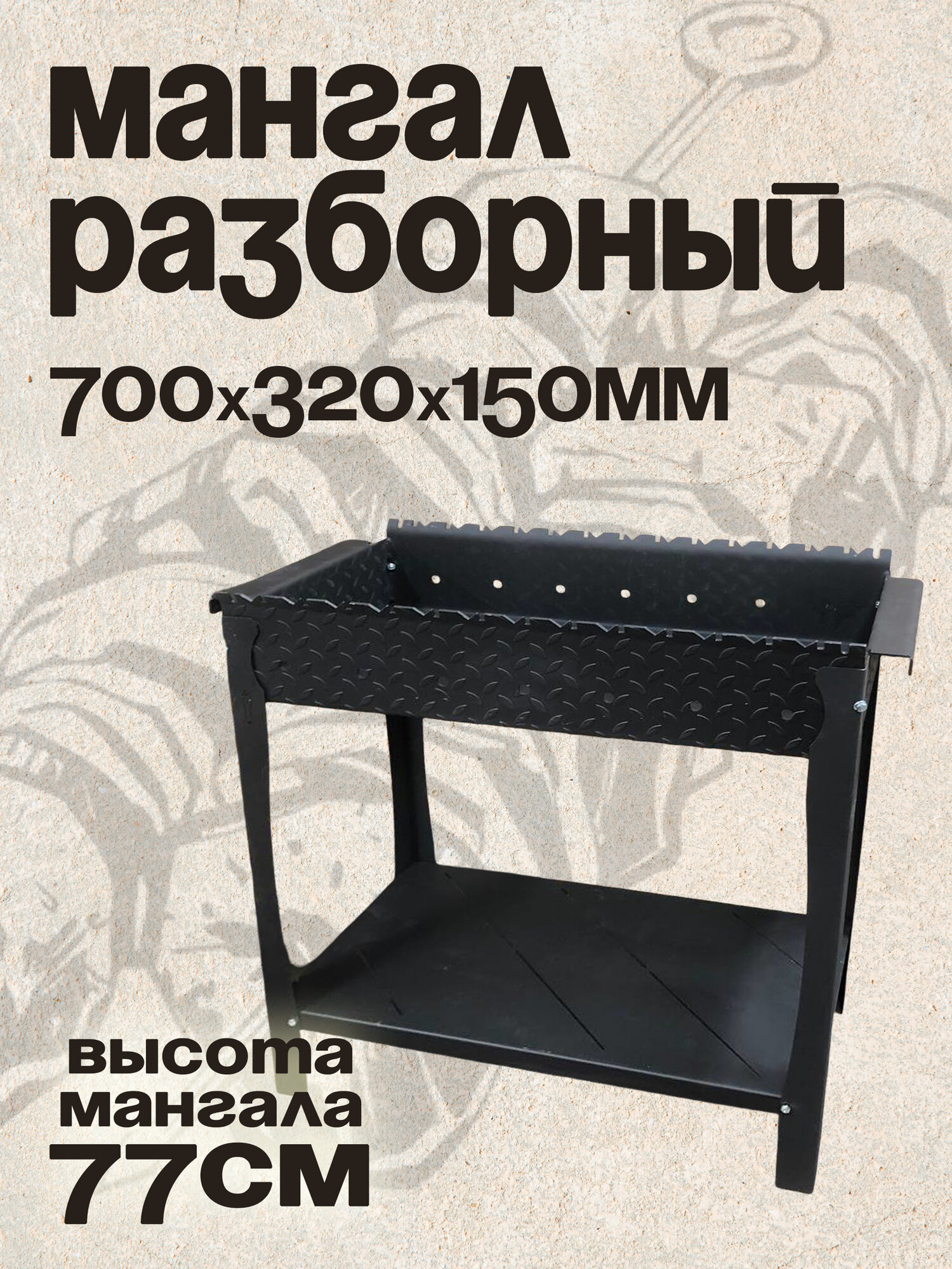 Мангал имеет компактные размеры (длина 70 см, ширина 32 см, высота 15см) и легко разбирается, что позволяет его удобно хранить и транспортировать. Высота мангала от пола 85 см Ножки сталь 3 мм Окрашен огнеупорной краской церта 1200 градусов Нижняя полка для дров Собирается 8 болтами 13 удобных пазов под шампуры