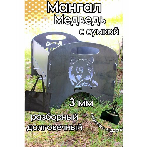 Мангал с рисунок медведь в комплекте с сумкой. Мангал сборный - разборный ,складной. многоразовый из стали 3 мм состоит из 5 частей ,при этом очень быстро собирается и разбирается. Можно переносить в собранном виде. Компактный при хранение. Для сборки не потребуется инструмента, толщина 3 мм не деформируется при долгой эксплуатации . Подходит для выезда на пикник, дачу, природу ,озеро для жарки шашлыка. На мангале помещается 7 шампуров и решетка .Идеальная глубина 15 см для углей равномерное распределение жара по мангалу. Мангал многоразовый не ведет при нагреве и прослужит долго. Отличный подарок мужчине парню и дедушке на день рождения ,Новый год .Размер в собранном виде, высота 25 см (с ручкой 30 см), ширина 30 см , длина 55 см