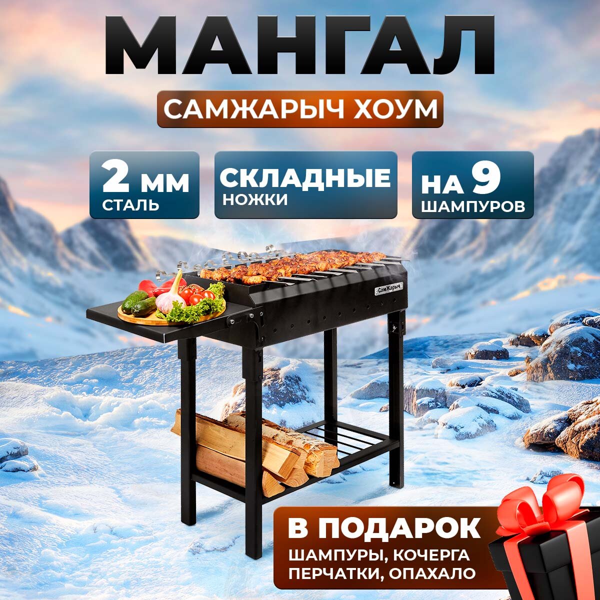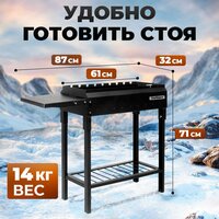 Мангал оборудован складным столом, на котором удобно располагать еду и напитки. Также в комплекте с мангалом идет дровница. Это делает его более функциональным и комфортным в использовании.