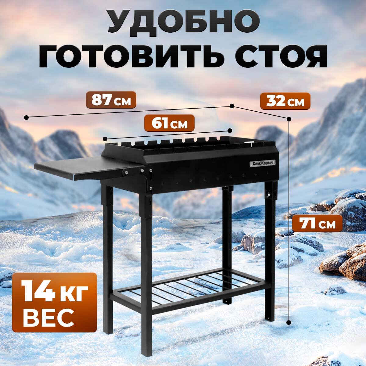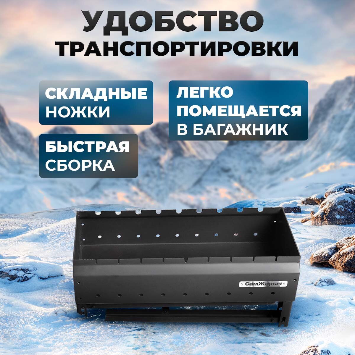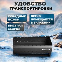 Благодаря компактным размерам в сложенном виде (63х32х27), складной мангал легко помещается в багажник машины, что делает его идеальным выбором для пикника или отдыха на природе.