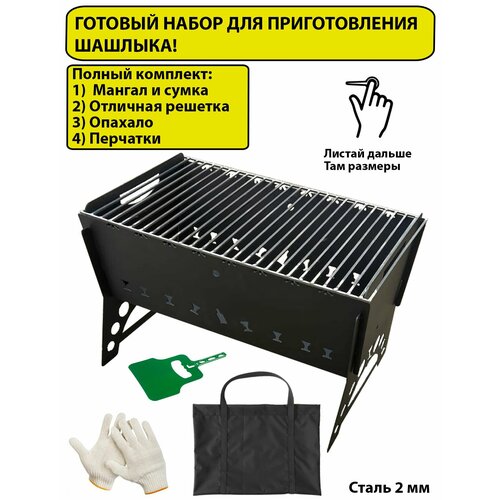 Для наших покупателей мы запускаем второй комплект нашего мангала. В него входит: мангал, сумка для переноски мангала, решетка, перчатки и опахало. Это готовый комплект для приготовления вкусных блюд на природе, на огне.